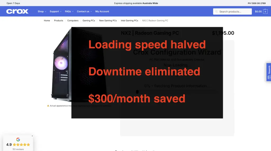 crox.com.au sells custom PC builds using the woocommerce composite products plugin. Pages were taking 30s to load and the site would frequently go down and get overwhelmed leading to lost orders. On a 1hr free call, we identified the root cause. After an investment of US$1300 in custom PHP fixes, the site is more than twice as fast, reliable and the founder was also able to save approximately US$300/month on expensive hosting costs that are no longer required.